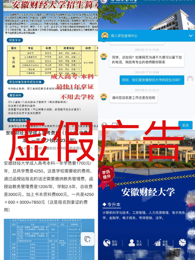 三、以安徽财经大学继续教育学院各类学历教育招生名义承诺的“全程无忧轻松拿证”、“交钱拿证、全程托管”、“包过班”、“包毕业”等招生广告均属于违规虚假宣传。